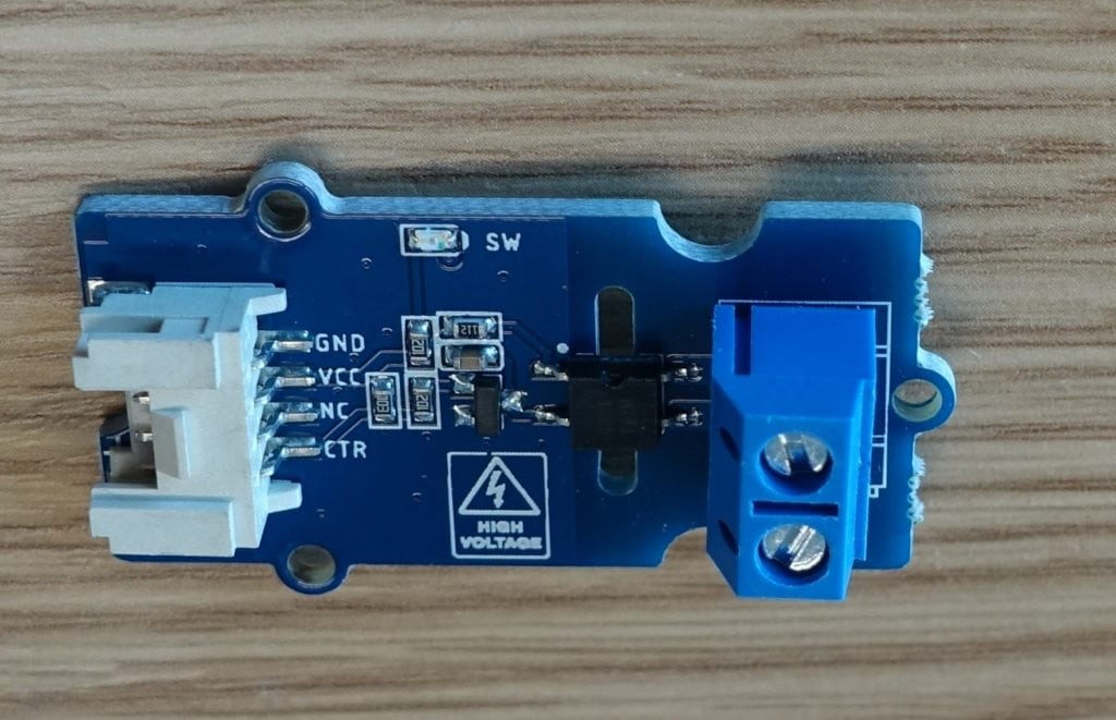 Grove M281 optocoupler relay board. The control pins are on the left, the relay pins are on the right.