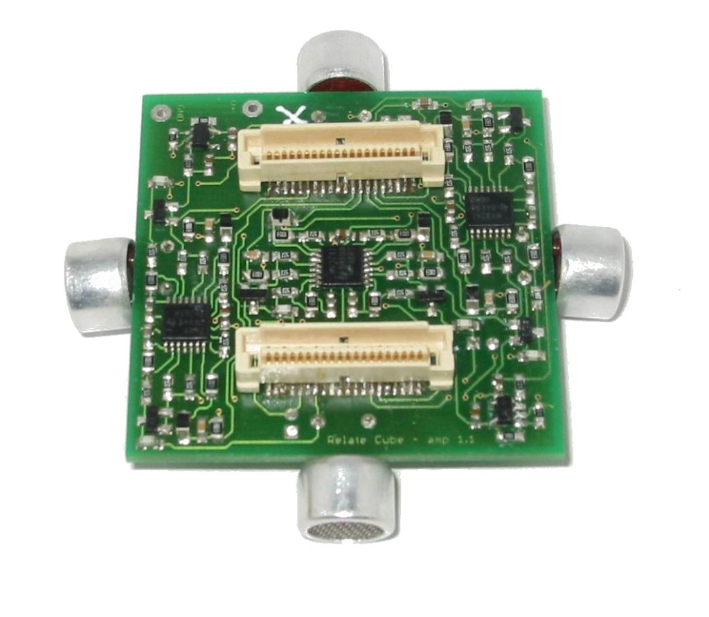 Six ultrasonic transducers are mounted on this board to allow for 3D ultrasonic ranging. The driving signals for the transducers originate on the Transmitter and Battery board. The received signals are amplified by a two stage amplifier circuit and passed to the DSP board as an analog signal. Plans have been made to construct an amplifier board where the analog signals are digitised then passed the the DSP board via an SPI interface. The image only shows four of the six transducers attached to the board - the last two are connected via flying leads to sockets on the board.