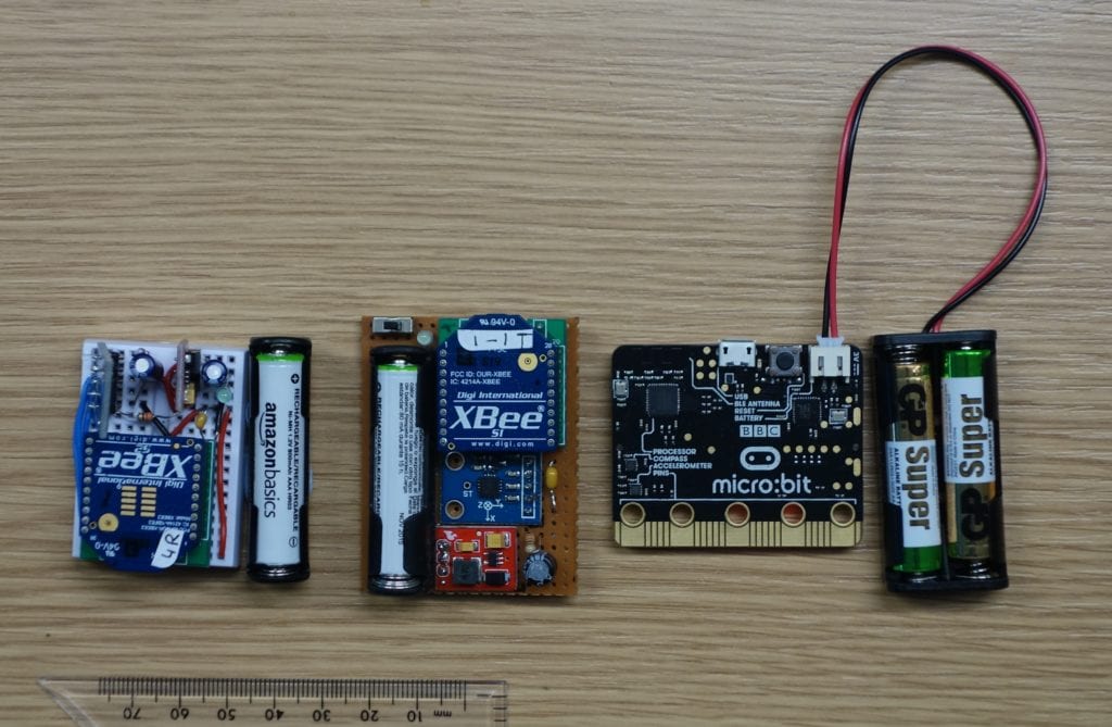 Here is a picture showing three iterations of hardware. On the left is an Xbee series 1 attached to an accelerometer kludged together on a breadboard. The board is powered by a single AAA battery using a dc-dc converter to pump up the voltage to 3.3v. In the middle is the same hardware, but soldered on to a prototype board. Best to solder everything down when it is being shaken around! On the right is the microbit board, powered by 2 AAA batteries, which is the board I am now using.
